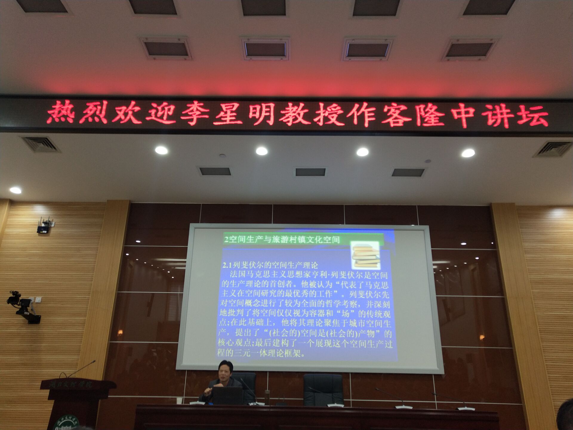 李教授以解说空间生产和旅游村镇文化空间研究思路及研究意义揭开了此次讲座的序幕。而对于旅游村镇文化空间的进一步构建,李教授则以湖北英山茶香文化小镇空间再生产为例进行解读。而其中,由“六碗茶”引申出的“七碗茶街”——“润坊”、“情坊”、“文坊”、“乐坊”、“香坊”、“仙坊”、“醉坊”,七坊坊坊有情,曰亲情、爱情、友情。此“七坊”乃是妙极!让人眼前一亮,又不似过眼云烟。而间配合着李教授深入浅出、通俗易懂的语言,又颇生动活泼的形式,惹得在座者掌声频频。