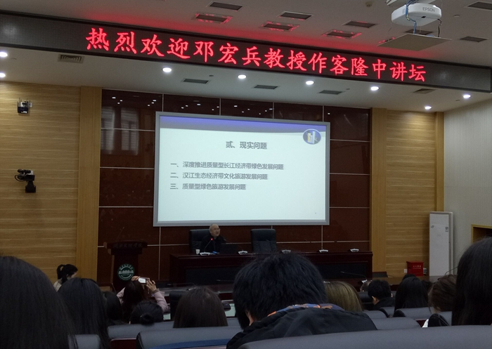 邓宏兵教授首先祝贺威廉官方网站成立六十周年以及威廉官方网站的成立,接着进行以“生态优先,绿色发展”为主题的专题讲座,探讨在资源环境的制约下长江经济带如何发展。邓宏兵教授的报告分三部分即现实问题,质量问题,以及给师生的建议。具体提出生态安全战略是前提和关键所在,大保护不等于不开发,而是要找到合适的方法、途径,从而进行循环、低碳发展;以长江经济带经济发展质量测量与评估为例,指出发展质量是核心工作;提出“神山•圣水•汉源”为主线介绍汉江生态经济带文化旅游发展问题。之后,邓教授提出:我们专业要打造“双一流”,在今后的发展中以与北大,国外地理旅游专业对接;我们老师要多做国家项目,多发高质量论文;我们同学要以考研,考博为目标的期望。