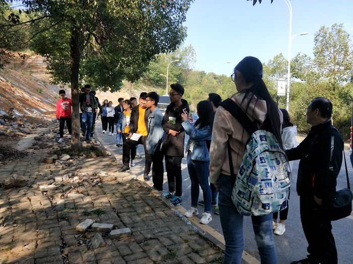 张忠旺实地讲解地质灾害类型 苏传芳摄 早上7:50分,全班同学集合完毕,在张忠旺的带领下前往大学路地质考察点,开展野外实地教学活动。同学们沿大学路前进,共走访沿途七个灾害点,由于部分灾害点场地正在施工修复,同学们在张忠旺的指导下,观察学习了灾害的施工类型和治理情况。 同学们积极提问,张忠旺耐心讲解,指导大家从观察土层、测量倾角、地质灾害点的实际情况出发,对各地质灾害点的情况进行分组分析。 此次实践教学,让同学们对《水土保持学》有了一个更直观的理解,巩固了基础知识,锻炼了理论的运用技能。