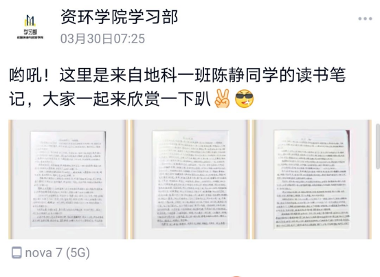 活动伊始,各班级根据每周的读书笔记批改情况,各选出了三位优秀读书笔记获奖同学,他们分别是地科一班的陈静、冯欣雨、余杭,地科二班的马天翼、朝兆萱、李思佳,旅管班的龙莹、陈婵娟、高琳洁,学习部为他们颁发荣誉证书,并收取了他们的读书笔记照片。后期每天由学习部官Q发表动态,对他们的优秀读书笔记进行表扬。