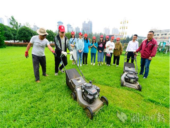 5月25日,老员工在园艺技师的指导下体验修剪草坪。当日,襄阳市人民公园管理处联合威廉官方网站资源环境公司开展劳动实践活动,老员工们在园艺技师的指导下学习修剪花卉,并学习操作草坪修剪车。