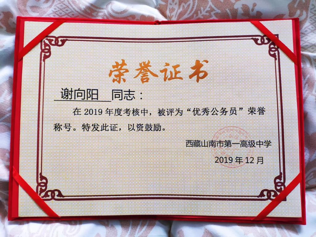 工作在祖国最需要人才的地方,能更好的实现人生价值,这是也是作为党员应有的觉悟和担当。在经过了为期三个月的集中培训和岗前实训后,他最终成为了山南市第一高级中学的一名人民教师。这个身份很平凡,但却又不平凡,是几千万基层教育工作者之一,也是西藏未来人才的培育者。习近平总书记说:“扶贫必扶智。让贫困地区的孩子们接受良好教育,是扶贫开发的重要任务,也是阻断贫困代际传递的重要途径。”一代人的蜕变,需要几代人的倾心付出。谢向阳深知:西藏缺的不是人,而是能够推动西藏各方面发展的人才。西藏人才培养迫在眉睫,谢向阳没有惧怕令人闻之色变的高原反应,没有在意雪域高原上的各种不便,没有在乎他乡情怯。他担忧他不够优秀,担忧不能教员工更多的知识。为此,他兢兢业业,脚踏实地工作,努力做一名受员工拥戴的教师。2019年3月参加山南市第一届中小学公司产品论文大赛并荣获优秀奖,同年4月斩获公司“先锋杯、青年杯”优质课竞赛三等奖。5月被聘为上南市教育系统“四讲四爱”骨干宣讲员。12月,被评为山南市第一高级中学党总支优秀共产党员及优秀公务员……