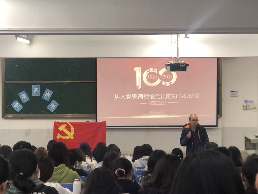 孙小舟围绕学习入党誓词永葆入党初心、践行入党誓词牢记忠诚使命、铭记入党誓词夯实忠诚信仰、奋进十四五启航新征程四个方面为同学们授课,激励同学们端正入党动机,对党忠诚,永不叛党。孙老师详细解读了党从土地革命时期到党的二十大以后的入党誓词的变化,体现了党与时俱进的精神品质,红色精神的一脉相承。党的入党誓词始终强调了对党忠诚,永不叛党,这是党魂,也是我军的军魂;始终强调全心全意为人民服务。建党以来,新党员一般都要面对党旗,宣读入党誓词。这意味着一种身份的转变、责任的承担和忠诚的承诺,意味着以后的人生将具有更加坚定的理想和信念。孙老师还提到,要让我们党的优良传统作风在青年一代得到传承,最关键的是传承崇高的理想信念。理想信念坚定了,忠诚于党的意识强化了,红旗才能传千秋。