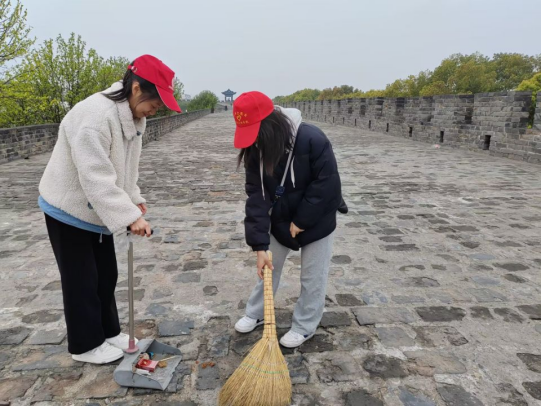 早上7点50,天气微凉,春风拂面。志愿者准时在校门口集合,待活动负责人说明活动内容及注意事项后,便带领志愿者们乘坐公交车前往襄阳古城昭明台。活动开始前负责人钦云菲发放小红帽,方雨蝶将志愿者分为两个小组清扫两个分区。确定清扫范围后,志愿者按部就班,手拿清扫工具开始清扫古城墙上的垃圾。站在古城上,志愿者干劲十足,都积极配合,高效率完成任务。待清扫活动结束后,古城墙上更显干净整洁。最后,志愿者在昭明台集合并拍照,负责人方雨蝶收回小红帽。至此,本次志愿服务活动圆满结束。